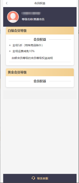 给某一等级会员的减价奖励优惠(值为空代表不设置折扣/减免运费)。用于会员专属促销活动。折扣运费减免可在前端会员等级权益页面显示,如下图