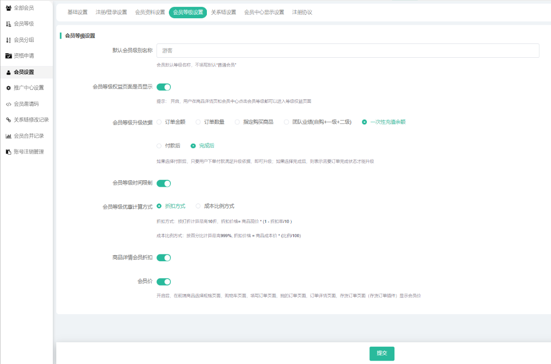 所有成为商城的会员等级为默认等级,可以通过后台-会员管理手动调整会员等级,也可以设置会员自动升级。