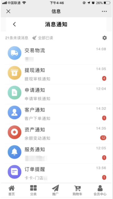 用户在前端会员中心--消息栏目中可以查看交易物流、提现通知、申请通知、客户通知、资产通知、服务通知、订单提醒、客服通知、后台推送的活动优惠等信息。