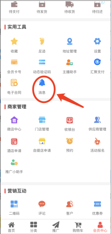 1.入口:会员中心--消息,如下图: