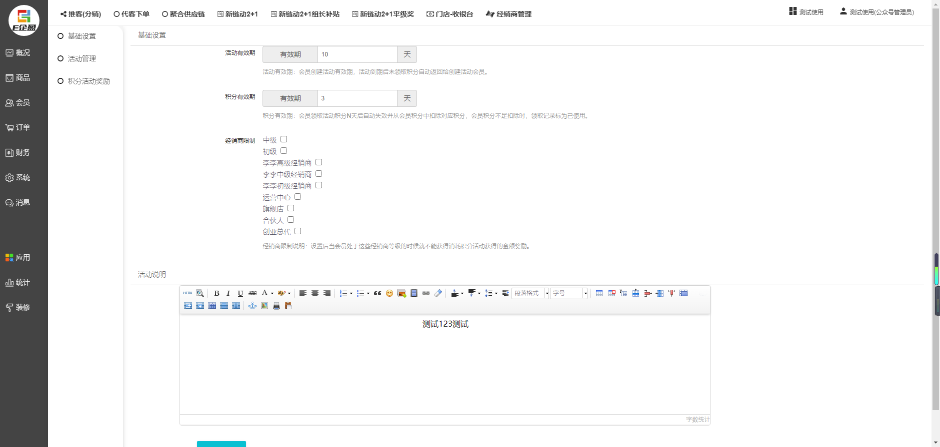 1,基础设置 活动有效期,活动到期后未领取积分自动返回给创建活动会员。天数仅支持整数。不填为空默认永久有效。